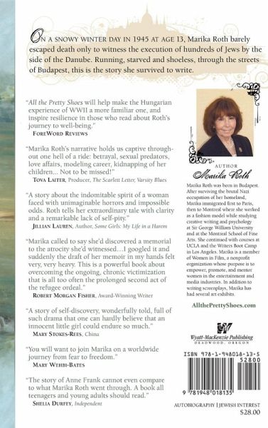 On a snowy winter day in 1945 at age 12, Marika Roth barely escaped her own death only to witness the execution of hundreds of Jews by the side of the Danube. Running, starved and shoeless, through the streets of Budapest, ALL THE PRETTY SHOES is the story she survived to write. "Marika Roth's narrative holds us captive throughout one hell of a ride: betrayal, sexual predators, love affairs, modeling career, kidnapping of her children... Not to be missed!" -Tova Laiter, Producer, The Scarlett Letter and Varsity Blues "A story about the indomitable spirit of a woman faced with unimaginable horrors and impossible odds. Roth tells her extraordinary tale with clarity and a remarkable lack of self-pity." -Jillian Lauren, Author, SOME GIRLS: MY LIFE IN A HAREM "I remember Marika calling to say she'd discovered a memorial to the atrocity she'd witnessed ... I googled it and suddenly the draft of her memoir in my hands felt very, very heavy. This is a powerful book about overcoming the ongoing, chronic victimization that is all too often the prolonged second act of the refugee ordeal." -Robert Morgan Fisher, Award-Winning Writer ..".plucks at an emotional inner chord and serves as a portrayal of hope for the human condition." -Stefan Pollack, The Pollack PR Marketing Group "I have read books about how people suffered during WWII, like Imre Kertesz who won the Nobel Prize, but none moved me as much as ALL THE PRETTY SHOES. Roth's style, the way she narrated how cruel life can be, without judging others, truly brought tears to my eyes." -Vivian Nagy, Hungary "A story of self-discovery, wonderfully told, full of such drama that one can hardly believe that an innocent little girl could endure so much. I couldn't put it down!" -Mary Stokes-Rees, China "The story of Anne Frank cannot even compare to what Marika went through. A book all teenagers and young adults should read." -Shelia Durfey, Independent