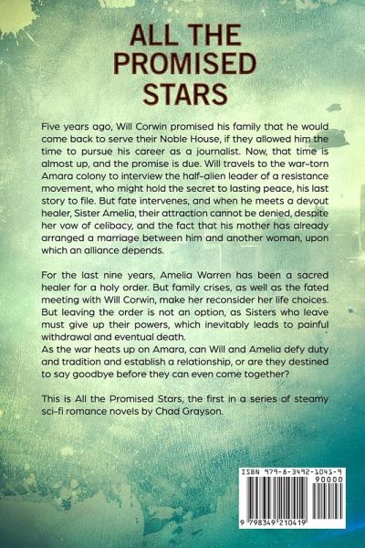 Five years ago, Will Corwin promised his family that he would come back to serve their Noble House, if they allowed him the time to pursue his career as a journalist. Now, that time is almost up, and the promise is due. Will travels to the war-torn Amara colony to interview the half-alien leader of a resistance movement, who might hold the secret to lasting peace, his last story to file. But fate intervenes, and when he meets a devout healer, Sister Amelia, their attraction cannot be denied, despite her vow of celibacy, and the fact that his mother has already arranged a marriage between him and another woman, upon which an alliance depends. For the last nine years, Amelia Warren has been a sacred healer for a holy order. But family crises, as well as the fated meeting with Will Corwin, make her reconsider her life choices. But leaving the order is not an option, as Sisters who leave must give up their powers, which inevitably leads to painful withdrawal and eventual death. As the war heats up on Amara, can Will and Amelia defy duty and tradition and establish a relationship, or are they destined to say goodbye before they can even come together? This is All the Promised Stars, the first in a series of steamy sci-fi romance novels by Chad Grayson.