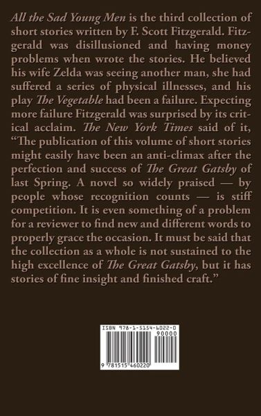 All the Sad Young Men is the third collection of short stories written by F. Scott Fitzgerald. Fitzgerald was disillusioned and having money problems when wrote the stories. He believed his wife Zelda was seeing another man, she had suffered a series of physical illnesses, and his play The Vegetable had been a failure. Expecting more failure Fitzgerald was surprised by its critical acclaim. The New York Times said of it, "The publication of this volume of short stories might easily have been an anti-climax after the perfection and success of The Great Gatsby of last Spring. A novel so widely praised - by people whose recognition counts - is stiff competition. It is even something of a problem for a reviewer to find new and different words to properly grace the occasion. It must be said that the collection as a whole is not sustained to the high excellence of The Great Gatsby, but it has stories of fine insight and finished craft."