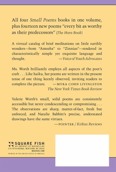 All the Small Poems and Fourteen More gathers all four of Valerie Worth's small poetry children's books and includes the original illustrations by Natalie Babbitt, the award-winning writer/artist of Tuck Everlasting. Inspired by her love of nature, Valerie Worth's wondrous verse about animals, plants, and other everyday objects presents a perfect perspective of the world through a child's eyes. This volume includes Small Poems, More Small Poems, Still More Small Poems , and Small Poems Again.
