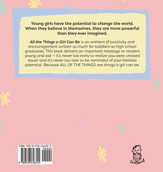 Young girls have the potential to change the world. When they believe in themselves and have the courage to stand up to gender stereotypes, they are more powerful than they ever imagined. All the Things a Girl Can Be is an anthem of positivity and encouragement written as much for toddlers as high school graduates. Filled with colorful illustrations that pair 12 aspirational character traits with 24 male-dominated careers, this book delivers an important message to readers young and old - it's never too early to realize you were created equal and it's never too late to be reminded of your limitless potential. Because ALL OF THE THINGS are things a girl can be.