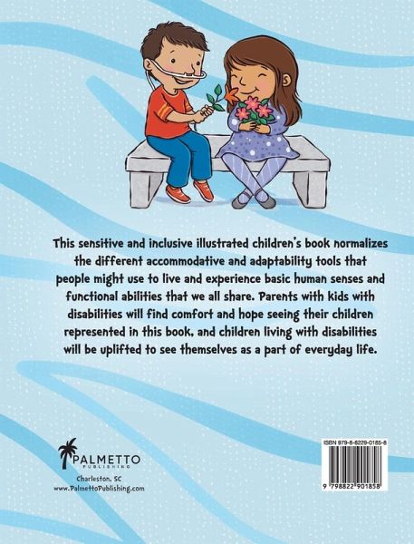 This sensitive, hopeful and inclusive, wonderfully illustrated children's book by Georgette Kores shows kids and normalizes the different tools that people might use to live and experience basic human things that we all share regardless of level of ability. There isn't just one way of using our senses and functional abilities. Disability is part of life, and there are so many ways people's lives can be enriched by utilizing various accommodative and adaptability tools available today. Life is always better when we can share and embrace the myriad ways people can have their human experience. Parents not exposed to disability can teach their children ages 2-6, and also become more comfortable themselves with seeing adaptive devices in various settings. Parents with kids with disabilities will find comfort and hope seeing their children represented in this book, and children living with disabilities will be uplifted to see themselves as a normal part of everyday life.