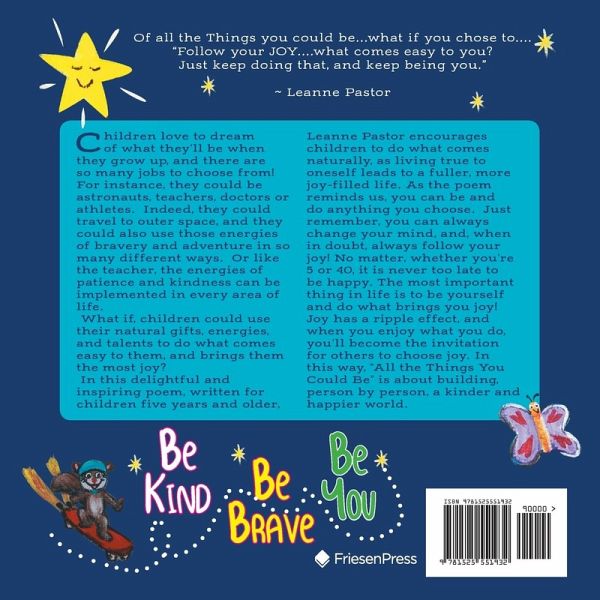 Children love to dream of what they'll be when they grow up, and there are so many jobs to choose from! For instance, they could be astronauts, teachers, doctors or athletes. Indeed, they could travel to outer space, and they could also use those energies of bravery and adventure in so many different ways. Or like the teacher, the energies of patience and kindness can be implemented in every area of life. What if, children could use their natural gifts, energies, and talents to do what comes easy to them, and brings them the most joy? In this delightful and inspiring poem, written for children five years and older, Leanne Pastor encourages children to do what comes naturally, as living true to oneself leads to a fuller, more joy-filled life. As the poem reminds us, you can be and do anything you choose. Just remember, you can always change your mind, and, when in doubt, always follow your joy! No matter, whether you're 5 or 40, it is never too late to be happy. The most important thing in life is to be yourself and do what brings you joy! Joy has a ripple effect, and when you enjoy what you do, you'll become the invitation for others to choose joy. In this way, "All the Things You Could Be" is about building, person by person, a kinder and happier world.