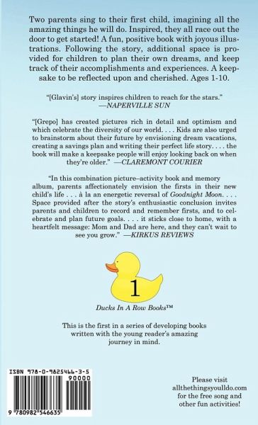 Book Description (formally called "Annotation"): Two parents sing to their first child, imagining all the amazing things he will do. Inspired, they all race out the door to get started! A fun, positive book with 20 joyous illustrations. Ages 1-10. Following the story, additional space is provided for children to plan their own dreams, and keep track of their accomplishments and experiences. A keepsake to be reflected upon and cherished. "[Glavin's] story inspires children to reach for the stars."--NAPERVILLE SUN "[Grepo] has created pictures rich in detail and optimism and which celebrate the diversity of our world. . . . Kids are also urged to brainstorm about their future by envisioning dream vacations, creating a savings plan and writing their perfect life story. . . . the book will make a keepsake people will enjoy looking back on when they're older."--CLAREMONT COURIER "In this combination picture-activity book and memory album, parents affectionately envision the firsts in their new child's life . . . à la an energetic reversal of "Goodnight Moon". . . . Space provided after the story's enthusiastic conclusion invites parents and children to record and remember firsts, and to celebrate and plan future goals. . . . it sticks close to home, with a heartfelt message: Mom and Dad are here, and they can't wait to see you grow."--KIRKUS REVIEWS