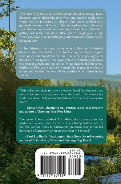 After surviving the usual debacles of adulthood (marriage, taxes, divorce), Ammi Midstokke does what any sensible single mom would do: She purchases an off-grid fixer-upper perched on a granite hilltop in rural Idaho. Underprepared and overcaffeinated, she embarks upon a series of seemingly inadvisable activities from getting lost in the mountains after dark to dangling on a rope with a chainsaw to relationshipping with bearded woodsmen and falling in love. In her hilarious yet sage debut essay collection, Midstokke demonstrates that battles with freeloading varmints, clogged stove pipes, childhood trauma, and one surprisingly aggressive boulder are unexpected, if not wonderfully entertaining, pathways to personal growth and joy. All the Things delivers the irreverent, fearless, and brilliant voice of a woman who laughs in the face of failure and soothes her wounds by splitting wood, often in her skivvies.