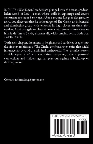 In "All The Way Down," readers are plunged into the tense, shadow-laden world of Lou-a man whose skills in espionage and covert operations are second to none. After a routine hit goes dangerously awry, Lou discovers that he is the target of The Circle, an influential and clandestine group with tentacles in high places. As the stakes escalate, Lou's struggle to clear his name and protect those close to him leads him to Sylvia, a former ally with complex ties to both Lou and The Circle. Together, they embark on a perilous journey to expose the corruption and power within The Circle, leveraging their collective expertise in technology, surveillance, and subterfuge. From dodging deadly traps to uncovering financial malfeasance, Lou and Sylvia maneuver through a labyrinth of danger and deceit, where trust is a liability, and betrayal comes from those closest to them. With each chapter, the intensity heightens as Lou delves deeper into the sinister ambitions of The Circle, confronting enemies that wield influence far beyond the criminal underworld. The narrative weaves a rich tapestry of character-driven suspense, where personal connections and hidden agendas play out against a backdrop of thrilling action. "All The Way Down" is not just a story of survival; it is a compelling examination of loyalty, power, and the lengths one man will go to for justice. This novel captivates and challenges, leaving readers on the edge of their seats until the final, explosive conclusion.