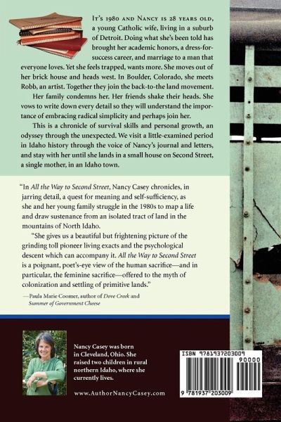 It's 1980 and Nancy is 28 years old, the perfect Catholic girl, living in a suburb of Detroit, doing what she is told. Her life has been a series of academic honors, followed by a dress-for-success career, and marriage to a man that everyone loves. Yet she feels trapped and wants more. She moves out of her brick house and heads west. In Boulder, Colorado, she meets Robb, an artist and writer. They move to Idaho and join the back-to-the land movement. Her family condemns her. Her friends shake their heads. She vows to write down every detail so they will understand the importance of embracing radical simplicity and perhaps join her. This is a chronicle of survival skills and personal growth, an odyssey through the unexpected. Through the voice of Nancy's journal and letters, we visit a little-examined period in Idaho history, when hippies were moving to the hills. We stay with her until she lands in a small house on Second Street, a single mother, in an Idaho town.