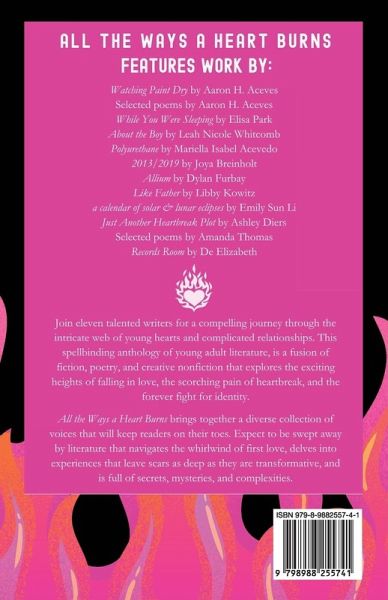 Join eleven talented writers for a compelling journey through the intricate web of young hearts and complicated relationships. This spellbinding anthology of young adult literature, is a fusion of fiction, poetry, and creative nonfiction that explores the exciting heights of falling in love, the scorching pain of heartbreak, and the forever fight for identity. All the Ways a Heart Burns brings together a diverse collection of voices that will keep readers on their toes. Expect to be swept away by literature that navigates the whirlwind of first love, delves into experiences that leave scars as deep as they are transformative, and is full of secrets, mysteries, and complexities.