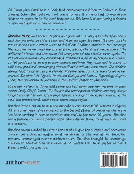 All Things Are Possible is a book that encourages children to believe in their dreams. When they believe, it will come to pass. It is important to encourage children to aspire to be the best they can be. This book is about having a dream or goal and knowing it can be achieved.