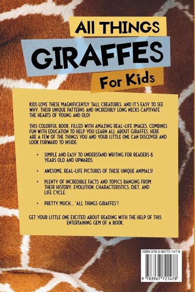 Treat the Little Giraffe Fan in Your Life With a Book Full of Reaaaallyy Looonngg Laughs! Kids love these magnificently tall creatures, and it's easy to see why. Their unique patterns and incredibly long necks captivate the hearts of young and old! This colorful book, filled with amazing real-life images, combines fun with education to help you learn all about giraffes. Here are a few of the things you and your little one can discover and look forward to inside:Simple and easy to understand writing for readers 6 years old and upwards. Awesome, real-life pictures of these unique animals! Plenty of incredible facts and topics ranging from their history, evolution, characteristics, diet, and life cycle. Pretty much... "ALL THINGS GIRAFFES"! Get your little one excited about reading with the help of this entertaining gem of a book!
