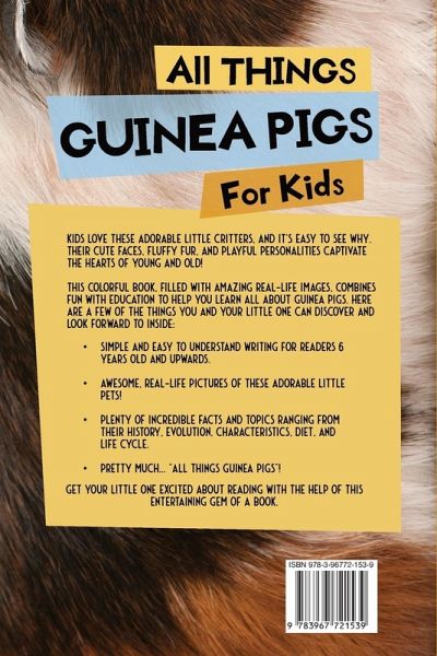 Treat the Little Guinea Pig Fan in Your Life With a Book That Will Make Them SQUEAK With Delight! Kids love these adorable little critters, and it's easy to see why. Their cute faces, fluffy fur, and playful personalities captivate the hearts of young and old! This colorful book, filled with amazing real-life images, combines fun with education to help you learn all about guinea pigs. Here are a few of the things you and your little one can discover and look forward to inside:Simple and easy to understand writing for readers 6 years old and upwards. Awesome, real-life pictures of these adorable little pets! Plenty of incredible facts and topics ranging from their history, evolution, characteristics, diet, and life cycle. Pretty much... "ALL THINGS GUINEA PIGS"! Get your little one excited about reading with the help of this entertaining gem of a book!