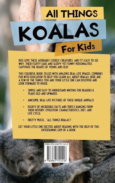 Treat the Little Koala Fan in Your Life With a KOALA-ty Book! Kids love these adorably cuddly creatures, and it's easy to see why. Their fluffy ears and sleepy yet funny personalities captivate the hearts of young and old! This colorful book, filled with amazing real-life images, combines fun with education to help you learn all about koalas. Here are a few of the things you and your little one can discover and look forward to inside:Simple and easy to understand writing for readers 6 years old and upwards. Awesome, real-life pictures of these unique animals! Plenty of incredible facts and topics ranging from their history, evolution, characteristics, diet, and life cycle. Pretty much... "ALL THINGS KOALAS"! Get your little one excited about reading with the help of this entertaining gem of a book!