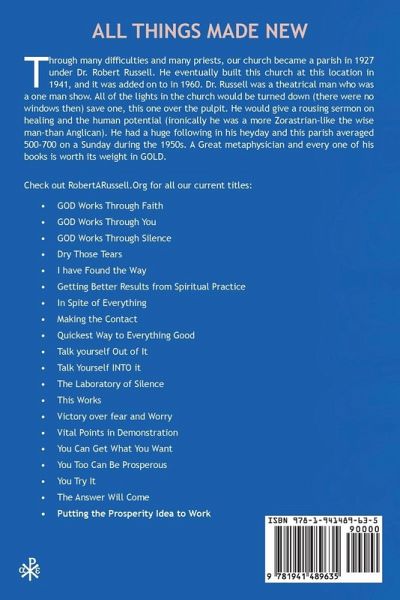 www.RobertARussell.Org It is my hope that this book will meet the needs of those who have grown with me in spiritual understanding, in awareness of the height and depth of God's love, and in realization of man's Oneness with Him; and that those who are taking their first steps on this joyous journey will find through it the Wisdom whose ways are ways of pleasantness and all whose paths are peace. Robert A. Russell Through many difficulties and many priests, our church became a parish in 1927 under Dr. Robert Russell. He eventually built this church at this location in 1941, and it was added on to in 1960. Dr. Russell was a theatrical man who was a one man show. All of the lights in the church would be turned down (there were no windows then) save one, this one over the pulpit. He would give a rousing sermon on healing and the human potential (ironically he was a more Zorastrian-like the wise man-than Anglican). He had a huge following in his heyday and this parish averaged 500-700 on a Sunday during the 1950s. A Great metaphysician and every one of his books is worth its weight in GOLD. Check out RobertARussell.Org for all our current titles: ¿ GOD Works Through Faith ¿ GOD Works Through You ¿ GOD Works Through Silence ¿ All Things Made New ¿ Dry Those Tears ¿ I have Found the Way ¿ Getting Better Results from Spiritual Practice ¿ In Spite of Everything ¿ Making the Contact ¿ Quickest Way to Everything Good ¿ Talk yourself Out of It ¿ Talk Yourself INTO it ¿ The Laboratory of Silence ¿ This Works ¿ Victory over fear and Worry ¿ Vital Points in Demonstration ¿ You Can Get What You Want ¿ You Too Can Be Prosperous ¿ You Try It ¿ The Answer Will Com Putting the Prosperity Principle to Work