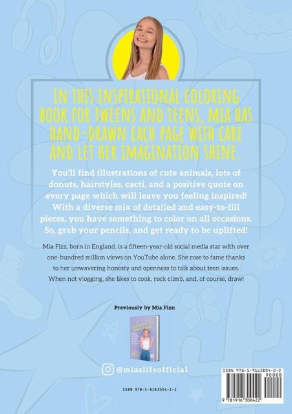In this inspirational coloring book for tweens and teens, Mia has hand-drawn each page with care and let her imagination shine.You'll find illustrations of cute animals, lots of donuts, fashion, cacti, and a positive quote on every page which will leave you feeling inspired. This coloring book also includes:A diverse mix of detailed and easy-to-fill pieces, so you have something to color on all occasions. Beautiful and trendy illustrations for you to express your creativity and make your masterpieces. Every image is single-sided to reduce bleed-through problems. Anyone can use this colouring book, no matter their skill level. There is no wrong way to color! The perfect gift for your daughter, sister, friend, or niece! Mia Fizz is a fifteen-year-old social media star with over 100 million views on her YouTube channel (Mia's Life). She's featured in numerous magazines, interviewed stars such as Mark Wahlberg (awkwardly!) and appeared in a sell-out live show alongside her family.