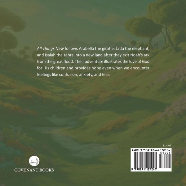 Back of Cover All Things New follows Arabella the giraffe, Jada the elephant, and Isaiah the zebra into a new land after they exit Noah's ark from the great flood. Their adventure illustrates the love of God for His children and provides hope even when we encounter feelings like confusion, anxiety, and fear.