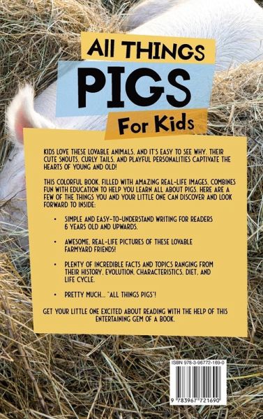 Treat the Little Pig Fan in Your Life With a Book That Will Have Them OINK-ing With Joy! Kids love these lovable animals, and it's easy to see why. Their cute snouts, curly tails, and playful personalities captivate the hearts of young and old! This colorful book, filled with amazing real-life images, combines fun with education to help you learn all about pigs. Here are a few of the things you and your little one can discover and look forward to inside:Simple and easy-to-understand writing for readers 6 years old and upwards. Awesome, real-life pictures of these lovable farmyard friends! Plenty of incredible facts and topics ranging from their history, evolution, characteristics, diet, and life cycle. Pretty much... "ALL THINGS PIGS"! Get your little one excited about reading with the help of this entertaining gem of a book!