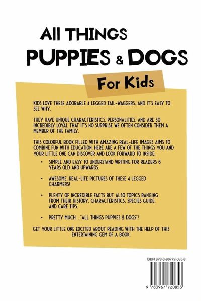 Treat the Little DOGGO Fan in Your Life With This PAWsome Book! Kids love these adorable 4 legged tail-waggers, and it's easy to see why. They have unique characteristics, personalities, and are so incredibly loyal that it's no surprise we often consider them a member of the family. This colorful book filled with amazing real-life images aims to combine fun with education. Here are a few of the things you and your little one can discover and look forward to inside:Simple and easy to understand writing for readers 6 years old and upwards. Awesome, real-life pictures of these 4 legged charmers! Plenty of incredible facts but also topics ranging from their history, characteristics, species guide, and care tips. Pretty much... "ALL THINGS PUPPIES & DOGS"! Get your little one excited about reading with the help of this entertaining gem of a book.