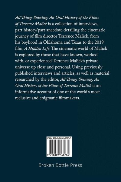 All Things Shining: An Oral History of the Films of Terrence Malick is a collection of interviews and recollections--part history, part anecdote--detailing the journey of American film director Terrence Malick, from his boyhood in Oklahoma and Texas to the rich universe of his filmmaking. The cinematic universe of Malick is explored by those who have known, worked with, or experienced this reclusive auteur's private universe up close and personal. Utlizing previously published interviews and articles with original material researched by the editor, All Things Shining promises to be an instantly readable and informative account of one of the world's most reclusive and enigmatic filmmakers.
