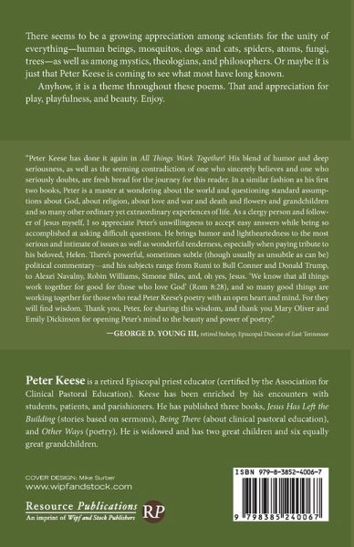 There seems to be a growing appreciation among scientists for the unity of everything--human beings, mosquitos, dogs and cats, spiders, atoms, fungi, trees--as well as among mystics, theologians, and philosophers. Or maybe it is just that Peter Keese is coming to see what most have long known. Anyhow, it is a theme throughout these poems. That and appreciation for play, playfulness, and beauty. Enjoy.
