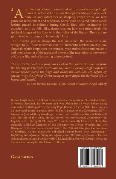 Bishop Hugh Gilbert OSB has been a Benedictine monk of Pluscarden Abbey in Moray, Scotland, for 50 years and was Abbot for 19 years before being nominated as Bishop of Aberdeen by Pope Benedict XVI in 2011. He chose as his episcopal motto a phrase from St Paul's Letter to the Colossians, 1:17-Omnia in Ipso, All things hold together in Him (Christ), a motto which fits well with the title of this book. He has sat on the International Commission on English in the Liturgy (ICEL) since 2015 and is currently Chairman. He is also currently a Bishop Member of the Dicastery for Divine Worship and the Discipline of the Sacraments, and Chair of the National Liturgical Commission of Scotland. He has previously published several books with Gracewing-Unfolding the Mystery, Living the Mystery and The Tale of Quisquis. He has also published several booklets with CTS, including Hearing Christ's Voice, on the new Lectionary for the Church in Britain.