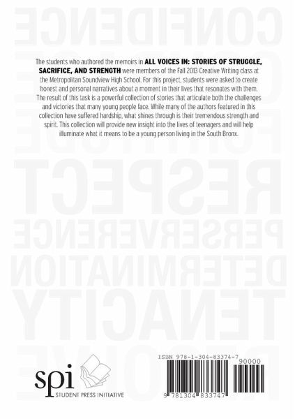 The students who authored the memoirs in All Voices In: Stories of Struggle, Sacrifice, and Strength were members of the Fall 2013 Creative Writing class at the Metropolitan Soundview High School. For this project, students were asked to create honest and personal narratives about a moment in their lives that resonates with them. The result of this task is a powerful collection of stories that articulate both the challenges and victories that many young people face. While many of the authors featured in this collection have suffered hardship, what shines through is their tremendous strength and spirit. This collection will provide new insight into the lives of teenagers and will help illuminate what it means to be a young person living in the South Bronx.