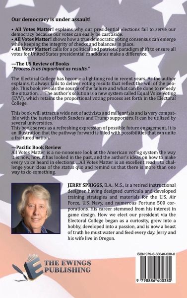 Our democracy is under assault! ¿ All Votes Matter! explains why our presidential elections fail to serve our democracy because our votes can easily be cast aside. ¿ All Votes Matter! shows how a true democratic voting consensus can emerge while keeping the integrity of checks and balances in place. ¿ All Votes Matter! calls for a political and patriotic paradigm shift to ensure all votes for United States presidential candidates make a difference. -The US Review of Books "Process is as important as results." The Electoral College has become a lightning rod in recent years. As the author explains, it always fails to deliver voting results that reflect the will of the people. This book reveals the source of the failure and what can be done to remedy the situation. ... The author's solution is a new system called Equal Voice Voting (EVV), which retains the proportional voting process set forth in the Electoral College. This book will attract a wide net of activists and millennials and is very compatible with the tastes of both Sanders and Trump supporters. It can be utilized by several universities. This book serves as a refreshing expression of possible future engagement. It is an illustration that the pathway forward is filled with possibilities that can unite a fractured nation. -Pacific Book Review All Votes Matter is a no-nonsense look at the American voting system the way it is now, how it has looked in the past, and the author's ideas on how to make every voice heard in elections. ...All Votes Matter is an excellent read... to challenge your ideas of the status quo and remind us that there is more than one way to do something.
