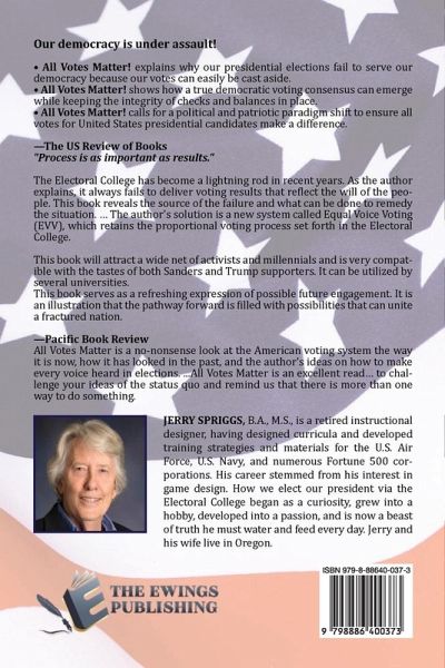 Our democracy is under assault! ¿ All Votes Matter! explains why our presidential elections fail to serve our democracy because our votes can easily be cast aside. ¿ All Votes Matter! shows how a true democratic voting consensus can emerge while keeping the integrity of checks and balances in place. ¿ All Votes Matter! calls for a political and patriotic paradigm shift to ensure all votes for United States presidential candidates make a difference. -The US Review of Books "Process is as important as results." The Electoral College has become a lightning rod in recent years. As the author explains, it always fails to deliver voting results that reflect the will of the people. This book reveals the source of the failure and what can be done to remedy the situation. ... The author's solution is a new system called Equal Voice Voting (EVV), which retains the proportional voting process set forth in the Electoral College. This book will attract a wide net of activists and millennials and is very compatible with the tastes of both Sanders and Trump supporters. It can be utilized by several universities. This book serves as a refreshing expression of possible future engagement. It is an illustration that the pathway forward is filled with possibilities that can unite a fractured nation. -Pacific Book Review All Votes Matter is a no-nonsense look at the American voting system the way it is now, how it has looked in the past, and the author's ideas on how to make every voice heard in elections. ...All Votes Matter is an excellent read... to challenge your ideas of the status quo and remind us that there is more than one way to do something.