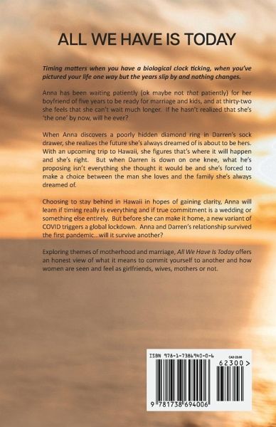 Timing matters when you have a biological clock ticking, when you've pictured your life one way but the years slip by and nothing changes. Anna has been waiting patiently (ok maybe not that patiently) for her boyfriend of five years to be ready for marriage and kids, and at thirty-two she feels that she can't wait much longer. If he hasn't realized that she's 'the one' by now, will he ever? When Anna discovers a poorly hidden diamond ring in Darren's sock drawer, she realizes the future she's always dreamed of is about to be hers. With an upcoming trip to Hawaii, she figures that's where it will happen and she's right. But when Darren is down on one knee, what he's proposing isn't everything she thought it would be and she's forced to make a choice between the man she loves and the family she's always dreamed of. Choosing to stay behind in Hawaii in hopes of gaining clarity, Anna will learn if timing really is everything and if true commitment is a wedding or something else entirely. But before she can make it home, a new variant of COVID triggers a global lockdown. Anna and Darren's relationship survived the first pandemic...will it survive another? Exploring themes of motherhood and marriage, All We Have Is Today offers an honest view of what it means to commit yourself to another and how women are seen and feel as girlfriends, wives, mothers or not.