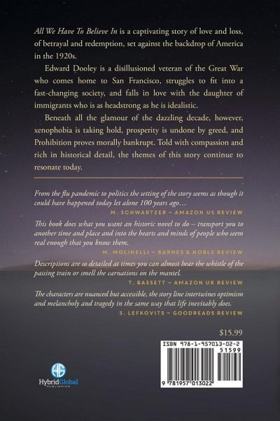 All We Have To Believe In is a captivating story of love and loss, of betrayal and redemption, set against the backdrop of America in the 1920s. Edward Dooley is a disillusioned veteran of the Great War who comes home to San Francisco, struggles to fit into a fast-changing society, and falls in love with the daughter of immigrants who is as headstrong as he is idealistic. Beneath all the glamour of the dazzling decade, however, xenophobia is taking hold, prosperity is undone by greed, and Prohibition proves morally bankrupt. Told with compassion and rich in historical detail, the themes of this story continue to resonate today.