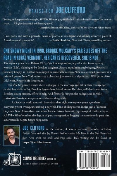 One snowy night in 1998, Brooke Mulcahy's car slides off the road in rural Vermont. Her car is discovered. She is not. Twenty-one years later, Robert Kirby, Brooke's stepbrother, is paid a visit from a young woman (Lily), claiming to be Brooke's daughter. Since a tumultuous upbringing, Robert, formerly known as "Bobby," has enjoyed considerable success. Now an esteemed professor at a private Upstate New York university, Robert has just received a significant NEH grant. After Lily's visit, Robert's life is upended. His wife Stephanie reveals she is unhappy in the marriage and takes their teenage son to visit her sister in PA. Brooke's former best friend, Aaron Reardon, still devastated from Brooke's disappearance, offers to help. And forever lurking in the background is Mike Rakowski, Brooke's ex, a possessive, abusive drug addict. As Robert's world unravels, he revisits that night twenty-one years ago where everything went wrong, unearthing a horrible, bone-chilling secret. In the vein of Simone St. James' Sun Down Motel and other female-driven domestic psychological thrillers today, All Who Wander mines the depths of past transgression, begging the question: do past sins automatically negate future happiness?