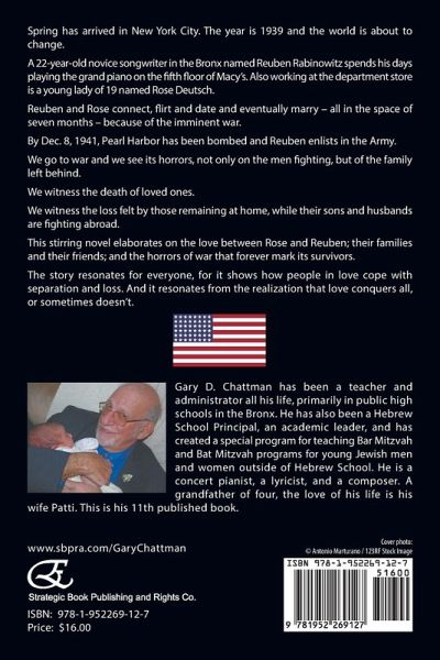 Spring has arrived in New York City. The year is 1939 and the world is about to change. A 22-year-old novice songwriter in the Bronx named Reuben Rabinowitz spends his days playing the grand piano on the fifth floor of Macy’s. Also working at the department store is a young lady of 19 named Rose Deutsch. Reuben and Rose connect, flirt and date and eventually marry – all in the space of seven months – because of the imminent war. By Dec. 8, 1941, Pearl Harbor has been bombed and Reuben enlists in the Army. We go to war and we see its horrors, not only on the men fighting, but of the family left behind. We witness the death of loved ones. We witness the loss felt by those remaining at home, while their sons and husbands are fighting abroad. This stirring novel elaborates on the love between Rose and Reuben; their families and their friends; and the horrors of war that forever mark its survivors. The story resonates for everyone, for it shows how people in love cope with separation and loss. And it resonates from the realization that love conquers all, or sometimes doesn’t. (About the Author) Gary D. Chattman has been a teacher and administrator all his life, primarily in public high schools in the Bronx. He has also been a Hebrew School Principal, an academic leader, and has created a special program for teaching Bar Mitzvah and Bat Mitzvah programs for young Jewish men and women outside of Hebrew School. He is a concert pianist, a lyricist, and a composer. A grandfather of four, the love of his life is his wife Patti. This is his 11th published book.