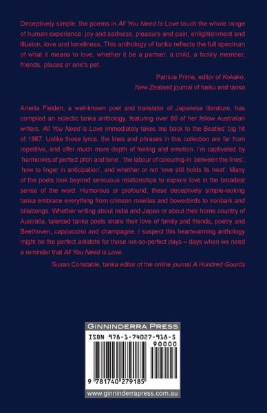 Deceptively simple, the poems in All You Need Is Love touch the whole range of human experience: joy and sadness, pleasure and pain, enlightenment and illusion, love and loneliness. This anthology of tanka reflects the full spectrum of what it means to love, whether it be a partner, a child, a family member, friends, places or one's pet. - Patricia Prime, editor of Kokako, ¿New Zealand journal of haiku and tanka Amelia Fielden, a well-known poet and translator of Japanese literature, has compiled an eclectic tanka anthology, featuring over 60 of her fellow Australian writers. All You Need is Love immediately takes me back to the Beatles' big hit of 1967. Unlike those lyrics, the lines and phrases in this collection are far from repetitive, and offer much more depth of feeling and emotion. I'm captivated by 'harmonies of perfect pitch and tone', 'the labour of colouring-in between the lines', 'how to linger in anticipation', and whether or not 'love still holds its heat'. Many of the poets look beyond sensuous relationships to explore love in the broadest sense of the word. Humorous or profound, these deceptively simple-looking tanka embrace everything from crimson rosellas and bowerbirds to ironbark and billabongs. Whether writing about India and Japan or about their home country of Australia, talented tanka poets share their love of family and friends, poetry and Beethoven, cappuccino and champagne. I suspect this heartwarming anthology might be the perfect antidote for those not-so-perfect days - days when we need a reminder that All You Need is Love. - Susan Constable, tanka editor of the online journal A Hundred Gourds
