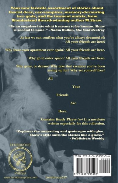 "Explores the unnerving and grotesque with glee. Shaw's loose, easy style suits the stories like a glove. Fans of new weird horror will want to check this out."Publishers Weekly "Unforgettable, ominous, and provocative. Shaw is a voice to watch in Weird fiction."Library Journal, starred review "Dark elegies of loneliness and dissolution set in a world left dangling at the end of history. As an enquirer into the question of what it means to be human, M. Shaw is second to none."Nadia Bulkin, She Said Destroy Your new favourite assortment of New Weird Lit stories about car-vampires; fascist deer; memory-devouring tree gods; and the torment matrix; from Wonderland Award-winning author M.Shaw (One Hand to Hold, One Hand to Carve). At last we can confirm what you've always dreamed of: All your friends are here! Why leave your apartment ever again? All your friends are here. Why go to outer space? All your friends are here. Why grow, or dream? Why take that vacation you've been saving up for? Why set yourself free? All your friends are here. Contains a novelette written especially for this collection, Ready Player (n+1).