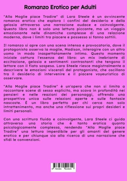 "Alla Moglie piace Tradire" di Lara Steele è un avvincente romanzo erotico che esplora i confini del desiderio e della gelosia attraverso una narrazione audace e coinvolgente. Questo libro non è solo una lettura piccante, ma un viaggio emozionante nelle dinamiche complesse di una relazione moderna, dove i limiti tra piacere e possesso si fanno sottili.Il romanzo si apre con una scena intensa e provocatoria, dove il protagonista osserva la moglie, Madison, interagire con un altro uomo in modo inaspettatamente intimo. Questo momento iniziale cattura l'essenza del libro: un mix inebriante di eccitazione, gelosia e sentimenti contrastanti che tengono il lettore con il fiato sospeso. Lara Steele riesce magistralmente a descrivere le emozioni viscerali del protagonista, che oscillano tra il desiderio di intervenire e il piacere voyeuristico di osservare."Alla Moglie piace Tradire" è un'opera che non si limita a raccontare scene di sesso esplicito, ma scava in profondità nei pensieri e nelle reazioni dei personaggi, offrendo una prospettiva unica sulle relazioni aperte e sulle fantasie nascoste. È un libro perfetto per chi cerca non solo intrattenimento, ma anche una riflessione sui propri desideri e limiti personali.Con una scrittura fluida e coinvolgente, Lara Steele ci guida attraverso una storia che è tanto erotica quanto psicologicamente complessa, rendendo "Alla Moglie piace Tradire" una lettura imperdibile per gli amanti del genere erotico e per chiunque sia alla ricerca di una narrazione che sfidi le convenzioni.