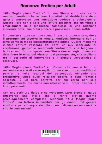 "Alla Moglie piace Tradire" di Lara Steele è un avvincente romanzo erotico che esplora i confini del desiderio e della gelosia attraverso una narrazione audace e coinvolgente. Questo libro non è solo una lettura piccante, ma un viaggio emozionante nelle dinamiche complesse di una relazione moderna, dove i limiti tra piacere e possesso si fanno sottili.Il romanzo si apre con una scena intensa e provocatoria, dove il protagonista osserva la moglie, Madison, interagire con un altro uomo in modo inaspettatamente intimo. Questo momento iniziale cattura l'essenza del libro: un mix inebriante di eccitazione, gelosia e sentimenti contrastanti che tengono il lettore con il fiato sospeso. Lara Steele riesce magistralmente a descrivere le emozioni viscerali del protagonista, che oscillano tra il desiderio di intervenire e il piacere voyeuristico di osservare."Alla Moglie piace Tradire" è un'opera che non si limita a raccontare scene di sesso esplicito, ma scava in profondità nei pensieri e nelle reazioni dei personaggi, offrendo una prospettiva unica sulle relazioni aperte e sulle fantasie nascoste. È un libro perfetto per chi cerca non solo intrattenimento, ma anche una riflessione sui propri desideri e limiti personali.Con una scrittura fluida e coinvolgente, Lara Steele ci guida attraverso una storia che è tanto erotica quanto psicologicamente complessa, rendendo "Alla Moglie piace Tradire" una lettura imperdibile per gli amanti del genere erotico e per chiunque sia alla ricerca di una narrazione che sfidi le convenzioni.