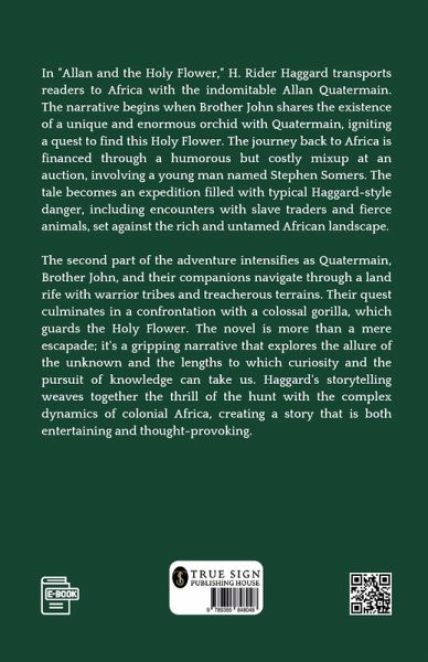 ""Allan and the Holy Flower"" is a thrilling adventure novel written by H. Rider Haggard. Set in colonial Africa, the story follows Allan Quatermain, a seasoned explorer, and his companions as they embark on a perilous journey to locate a legendary flower with mystical properties. Along the way, they encounter treacherous landscapes, hostile tribes, and formidable adversaries, all while contending with their own personal demons and conflicts. As they delve deeper into the heart of Africa, the quest for the Holy Flower becomes a test of courage, resilience, and moral integrity. Haggard's vivid descriptions, richly drawn characters, and pulse-pounding action sequences make ""Allan and the Holy Flower"" a riveting read that transports readers to a world of adventure, mystery, and discovery. With its blend of exotic settings, thrilling escapades, and philosophical undertones, the novel captivates audiences from start to finish, leaving a lasting impression long after the final page is turned.
