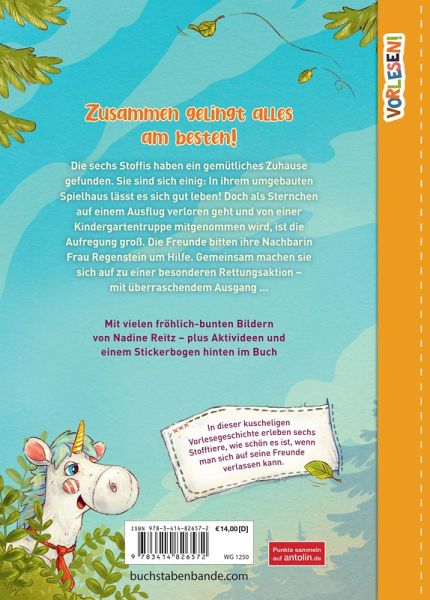 In dieser kuscheligen Vorlesegeschichte erleben sechs Stofftiere, wie schön es ist, wenn man sich auf seine Freunde verlassen kann.Die sechs Stoffis haben ein gemütliches Zuhause gefunden. Sie sind sich einig: In ihrem umgebauten Spielhaus lässt es sich gut leben! Doch als Sternchen auf einem Ausflug verloren geht und von einer Kindergartentruppe mitgenommen wird, ist die Aufregung groß. Die Freunde bitten ihre Nachbarin Frau Regenstein um Hilfe. Gemeinsam machen sie sich auf zu einer besonderen Rettungsaktion - mit überraschendem Ausgang ...Ein rundum besonderes Buch:Viele bunte Bilder von Nadine Reitz, die zum Entdecken einladen und viel Spaß machenPädagogisch wertvoll: vermittelt wichtige Werte und stärkt das Selbstvertrauen der Kinder, regt die Fantasie anMit süßen Stickern, die vorne ins Buch geklebt werden können, um den Lesefortschritt sichtbar zu machenAuch für die Schule geeignet: ein Quiz bei Antolin bietet eine Extra-Motivation für Selbstleser:innenAls Geschenk für alle Kinder ab 5 Jahren bestens geeignet