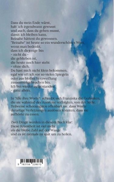 Dass du mein Ende wärst,hab´ ich irgendwann gewusstund auch, dass du gehen musst,damit ich bleiben kann.Beinahe hättest du gewonnen."Beinahe" ist heute so ein wunderschönes Wort, wenn man bedenkt, dass ich diejenige bin - nicht du - die geblieben ist, die heute noch hier steht- ohne dich. Du hast mich nicht klein bekommen, egal wie oft ich vor so vielen Spiegeln oder aus bloßer Verzweiflungzusammengebrochen bin. Ich bin wieder aufgestanden - ganz allein. In "Alle ihre Worte" schreibt sich Franziska die Gedanken, die sie während der Anorexie verfolgten, von der Seele. Teilweise schonungslos offenbart sie, dass Worte derartige Verletzungen auslösen konnten, dass sie aufhörte zu essen. Zwei Dinge werden in diesem Buch klar: Diese Krankheit ist viel mehr als die bloße Zahl auf der Waage und es ist niemals zu spät um zu heilen.
