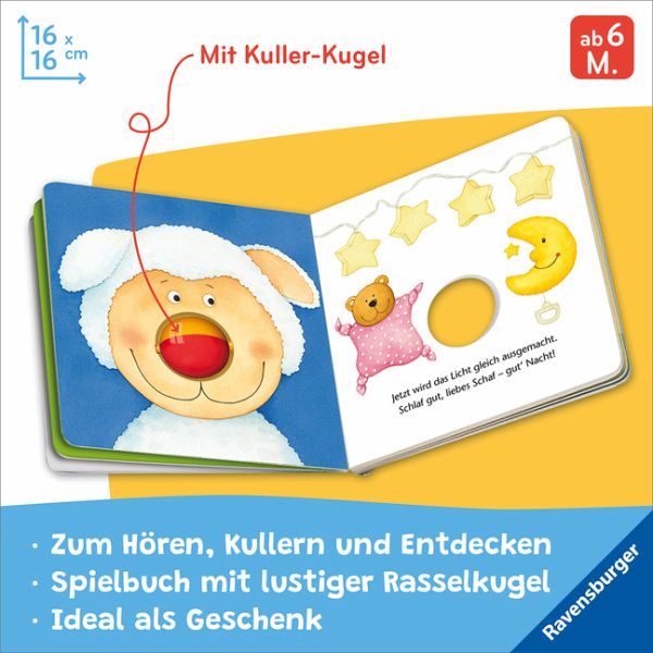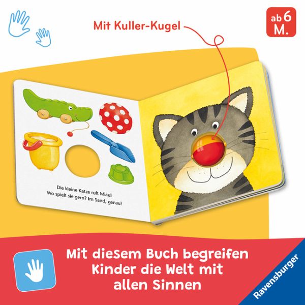 In diesem Buch werden die Tiere mit der rasselnden Kullernase zu lustigen Spielkameraden für die Kinder: Katze, Schwein, Biene, Hase und Schaf zeigen auf fünf Doppelseiten, was sie gerne tun. Schubsen die Kleinen die Kugel an, rasselt sie lustig. Das trainiert spielerisch die Motorik und das Hörvermögen der Kinder.