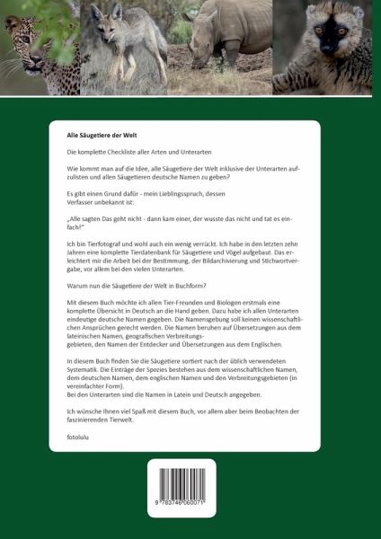 Wie kommt man auf die Idee, alle Säugetiere der Welt inklusive der Unterarten aufzulisten und allen Säugetieren deutsche Namen zu geben? Es gibt einen Grund dafür - mein Lieblingsspruch, dessen Verfasser unbekannt ist:"Alle sagten: Das geht nicht - dann kam einer, der wusste das nicht und tat es einfach!" Ich bin Tierfotograf und wohl auch ein wenig verrückt. Ich habe in den letzten zehn Jahren eine komplette Tierdatenbank für Säugetiere und Vögel aufgebaut. Das erleichtert mir die Arbeit bei der Bestimmung, der Bildarchivierung und Stichwortvergabe, vor allem bei den vielen Unterarten.Warum nun die Säugetiere der Welt in Buchform?Mit diesem Buch möchte ich allen Tier-Freunden und Biologen erstmals eine komplette Übersicht in Deutsch an die Hand geben. Dazu habe ich allen Unterarten eindeutige deutsche Namen gegeben. Die Namensgebung soll keinen wissenschaftlichen Ansprüchen gerecht werden. Die Namen beruhen auf Übersetzungen aus den lateinischen Namen, geografischen Verbreitungsgebieten, den Namen der Entdecker und Übersetzungen aus dem Englischen. In diesem Buch finden Sie die Säugetiere sortiert nach der üblich verwendeten Systematik. Die Einträge der Spezies bestehen aus dem wissenschaftlichen Namen, dem deutschen Namen, dem englischen Namen und den Verbreitungsgebieten (in vereinfachter Form). Bei den Unterarten sind die Namen in Latein und Deutsch angegeben.Ich wünsche Ihnen viel Spaß mit diesem Buch, vor allem aber beim Beobachten der faszinierenden Tierwelt.fotolulu