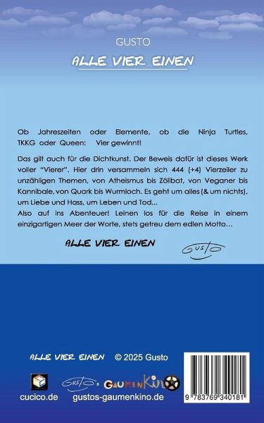 Alle vier einen - 444 Vierzeiler Ob Jahreszeiten oder Elemente, ob die Ninja Turtles, TKKG oder Queen: Vier gewinnt! Das gilt auch für die Dichtkunst. Der Beweis dafür ist dieses Werk voller "Vierer". Hier drin versammeln sich 444 (+4) Vierzeiler zu unzähligen Themen, von Atheismus bis Zölibat, von Veganer bis Kannibale, von Quark bis Wurmloch. Es geht um alles (& um nichts), um Liebe und Hass, um Leben und Tod... Also auf ins Abenteuer! Leinen los für die Reise in einem einzigartigen Meer der Worte, stets getreu dem edlen Motto... Alle vier einen