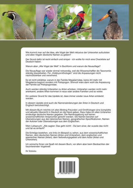 Wie kommt man auf die Idee, alle Vögel der Welt inklusive der Unterarten aufzulisten und allen Vögeln deutsche Namen zu geben? Der Grund dafür ist recht einfach und simpel - ich wollte für mich eine Checkliste auf Deutsch. Warum aber "Alle Vögel der Welt" in Buchform und warum die Neuauflage? Die Neuauflage war wieder einmal notwendig, weil die Wissenschaftler die Taxonomie ständig überarbeiten. Für "Hobbyornithologen" sind die Anpassungen nicht nachvollziehbar und verwirrend. Es ist nicht erklärbar, warum in der Familie Megalaimidae, keine Art mehr mit Megalaima beginnt sondern mit Psilopogon. Sinnvoll wäre dann wohl die Anpassung der Familie auf Psilopogonidae. Auch werden ständig Unterarten zu Arten erhoben, Unterarten werden nicht mehr anerkannt, andere Arten kommen in neue oder andere Familien und so weiter. Ein weiterer Grund für das Update ist, dass immer wieder neue Arten entdeckt werden. In diesem Update sind auch die Namensänderungen der Arten in Deutsch und Englisch berücksichtigt. Mit diesem Buch möchte ich allen Birding-Freunden und Ornithologen eine komplette und aktuelle Übersicht in Deutsch an die Hand geben. Dazu habe ich allen Unterarten eindeutige deutsche Namen gegeben. Die Namensgebung soll keinen wissenschaftlichen Ansprüchen gerecht werden. Die Namen beruhen auf Übersetzungen aus den lateinischen Namen, geografischen Spezifikationen, Namen der Autoren oder Übersetzungen aus dem Englischen. Mein Leitspruch: "Alle sagten: Das geht nicht! - Da kam einer, der wusste das nicht und tat es einfach!" Die Einträge bestehen, wie links im Beispiel zu sehen, aus dem wissenschaftlichen Namen, dem deutschen Namen (Arten und Unterarten), dem englischen und spanischen Namen (Arten), dem Verbreitungsgebiet und dem Autor (Arten und Unterarten). Ich wünsche Ihnen viel Spaß mit diesem Buch, vor allem aber beim Beobachten der faszinierenden Vogelwelt Ihr fotolulu