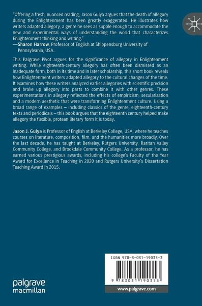 This Palgrave Pivot argues for the significance of allegory in Enlightenment writing. While eighteenth-century allegory has often been dismissed as an inadequate form, both in its time and in later scholarship, this short book reveals how Enlightenment writers adapted allegory to the cultural changes of the time. It examines how these writers analyzed earlier allegories with scientific precision and broke up allegory into parts to combine it with other genres. These experimentations in allegory reflected the effects of empiricism, secularization and a modern aesthetic that were transforming Enlightenment culture. Using a broad range of examples - including classics of the genre, eighteenth-century texts and periodicals - this book argues that the eighteenth century helped make allegory the flexible, protean literary form it is today.