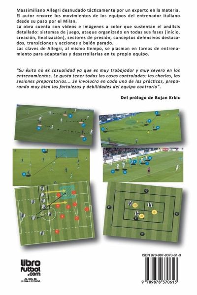 Massimiliano Allegri desnudado tácticamente por un experto en la materia. El autor recorre los movimientos de los equipos del entrenador italiano desde su paso por el Milan. La obra cuenta con videos e imágenes a color que sustentan el análisis detallado: sistemas de juego, ataque organizado en todas sus fases (inicio, creación, finalización), sectores de presión, conceptos defensivos destacados, transiciones y acciones a balón parado. Las claves de Allegri, al mismo tiempo, se plasman en tareas de entrenamiento para adaptarlas y desarrollarlas en tu propio equipo. "Su éxito no es casualidad ya que es muy trabajador y muy severo en los entrenamientos. Le gusta tener todas las cosas controladas: las charlas, las sesiones preparatorias... Se involucra en cada una de las prácticas, preparando muy bien las fortalezas y debilidades del equipo contrario". Del prólogo de Bojan Krkic.