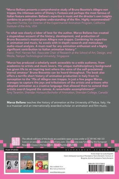 "A film that will let you see the music and listen to drawings; in a word, a film full of Fantasia!" Bruno Bozzetto's Allegro non Troppo tips its hand right away: it is an unabashed, yet full of admiration, retake on Walt Disney's 1940 "concert feature". The obvious nod to that model fuels many tongue-in-cheek jokes in the film; however, Allegro non Troppo soon departs from mere parody, and becomes a showcase for the multifaceted aesthetics of Italian animation in 1976, as well as a witty social satire and a powerful rethinking of the music-image relationship in cinema. Marco Bellano's open access book reconstructs the history of the production of Allegro non Troppo, on the basis of an original research developed with the contribution of Bozzetto himself; it also presents an audiovisual analysis of the work, as to reassess the international relevance of Bozzetto's achievements by giving insight into the director's creative process. The eBook editions of this book are available open access under a CC BY-NC-ND 4.0 licence on bloomsburycollections.com.