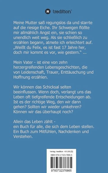 "Bis zur Hochzeit ist alles wieder gut."Das flüsterte mir Oma ins Ohr, wenn ich mich beim Spielen verletzt hatte, oder unendlich traurig war, weil mich meine Eltern wieder einmal nicht verstehen wollten.Omas tröstende Worte halfen zum Glück.Heute weiß ich, dass es mit einer Hochzeit kaum getan ist und dass es Eltern schwer haben, ihre Kinder immer zu verstehen.Doch die wohl wichtigste Erfahrung, die ich gemacht habe, ist, dass der Weg des Lebens, den wir alle gehen, nicht nur ebenmäßig verläuft. Des Öfteren stolpern wir über felsiges Geröll oder verirren uns im Nebelschleier der Gefühle und jeder muss für sich seinen Weg finden.Zehn Episoden und die Ballade am Ende des Buches erzählen von berührenden Schicksalen und tiefgreifenden Lebensentscheidungen.