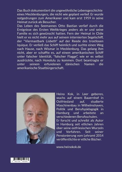 Das Buch dokumentiert das ungewöhnliche Leben eines Mecklenburgers, das durch die Wirren des Ersten Weltkrieges nicht wie geplant verlief. Er wurde notgedrungen zum Amerikaner und kam erst 1959 in seine Heimat zurück als Besucher.Die Lebensgeschichte des Seemannes Otto Bastian verlief durch die Ereignisse des Ersten Weltkrieges anders als er und seine Familie es sich gewünscht hatten. Fern der Heimat in Chile hielt er es nicht mehr aus auf seinem internierten Segelschiff, der "Viermastbark Lisbeth" auf der Reede des trostlosen Iquique. Er verließ das Schiff heimlich und suchte einen Weg nach Hause, nach Wismar in Mecklenburg. Das gelang ihm nicht, aber er schaffte es, auf einem amerikanischen Schiff unter falscher Identität, "falscher Flagge", wie er es selbst ausdrückte, nach Honolulu zu kommen. Dort beantragte er unter seinem erfundenen dänischen Namen die amerikanische Staatbürgerschaft.