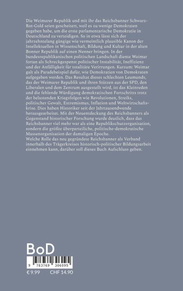 Die Weimarer Republik und mit ihr das Reichsbanner Schwarz-Rot-Gold seien gescheitert, weil es zu wenige Demokraten gegeben habe, um die erste parlamentarische Demokratie in Deutschland zu verteidigen. So in etwa lässt sich der jahrzehntelang gängige wie vermeintlich plausible Kanon der Intellektuellen in Wissenschaft, Bildung und Kultur in der alten Bonner Republik auf einen Nenner bringen. In der bundesrepublikanischen politischen Landschaft diente Weimar fortan als Schreckgespenst politischer Instabilität, Ineffizienz und der Anfälligkeit für totalitäre Verirrungen. Kurzum: Weimar galt als Paradebeispiel dafür, wie Demokratien von Demokraten aufgegeben werden. Das Resultat dieses schlechten Leumunds, das der Weimarer Republik und ihren Stützen aus der SPD, den Liberalen und dem Zentrum ausgestellt wird, ist das Kleinreden und die fehlende Würdigung demokratischen Fortschritts trotz der belastenden Kriegsfolgen wie Revolutionen, Streiks, politischer Gewalt, Extremismus, Inflation und Weltwirtschaftskrise. Dies haben Historiker seit der Jahrtausendwende herausgearbeitet. Mit der Neuentdeckung des Reichsbanners als Gegenstand historischer Forschung wurde deutlich, dass das Reichsbanner viel mehr war als eine Republikschutzorganisation, sondern die größte überparteiliche, politische-demokratische Massenorganisation der damaligen Epoche. Welche Rolle das neu gegründete Reichsbanner als Verband innerhalb des Trägerkreises historisch-politischer Bildungsarbeit einnehmen kann, darüber soll dieses Buch Aufschluss geben.