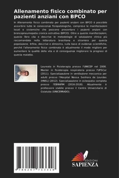 In Allenamento fisico combinato per pazienti anziani con BPCO è possibile assorbire tutte le conoscenze fisiopatologiche, comprese le manifestazioni locali e sistemiche che possono presentare i pazienti anziani con broncopneumopatia cronica ostruttiva (BPCO). Oltre a queste manifestazioni, questo libro cita e descrive le metodologie di valutazione clinica più raccomandate nella letteratura brasiliana e straniera per questa popolazione. Infine, descrive e dimostra, sulla base di evidenze scientifiche, perché l'allenamento fisico combinato è attualmente il modo migliore per aumentare la qualità della vita e di conseguenza migliorare la prognosi di questa malattia.