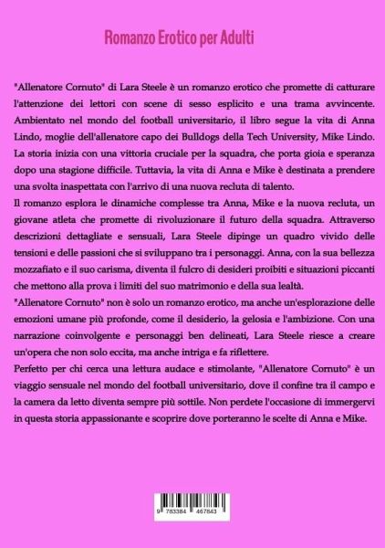 "Allenatore Cornuto" di Lara Steele è un romanzo erotico che promette di catturare l'attenzione dei lettori con scene di sesso esplicito e una trama avvincente. Ambientato nel mondo del football universitario, il libro segue la vita di Anna Lindo, moglie dell'allenatore capo dei Bulldogs della Tech University, Mike Lindo. La storia inizia con una vittoria cruciale per la squadra, che porta gioia e speranza dopo una stagione difficile. Tuttavia, la vita di Anna e Mike è destinata a prendere una svolta inaspettata con l'arrivo di una nuova recluta di talento.Il romanzo esplora le dinamiche complesse tra Anna, Mike e la nuova recluta, un giovane atleta che promette di rivoluzionare il futuro della squadra. Attraverso descrizioni dettagliate e sensuali, Lara Steele dipinge un quadro vivido delle tensioni e delle passioni che si sviluppano tra i personaggi. Anna, con la sua bellezza mozzafiato e il suo carisma, diventa il fulcro di desideri proibiti e situazioni piccanti che mettono alla prova i limiti del suo matrimonio e della sua lealtà."Allenatore Cornuto" non è solo un romanzo erotico, ma anche un'esplorazione delle emozioni umane più profonde, come il desiderio, la gelosia e l'ambizione. Con una narrazione coinvolgente e personaggi ben delineati, Lara Steele riesce a creare un'opera che non solo eccita, ma anche intriga e fa riflettere.Perfetto per chi cerca una lettura audace e stimolante, "Allenatore Cornuto" è un viaggio sensuale nel mondo del football universitario, dove il confine tra il campo e la camera da letto diventa sempre più sottile. Non perdete l'occasione di immergervi in questa storia appassionante e scoprire dove porteranno le scelte di Anna e Mike.